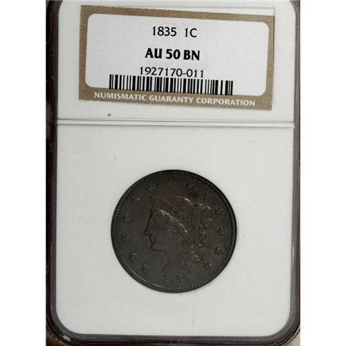 <B>1835 1C Head of 1836 AU50 NGC.</B></I> NGC Census: (7/120). PCGS Population (5/42). Mintage: 3,878,400. Numismedia Wsl. Price: $158. (#1714)<BR><BR><b>Shipping:</b> Coins & Currency (<a target="_blank" href="http://www.heritageauctions.com/common/shipping.php">view shipping information</a>)