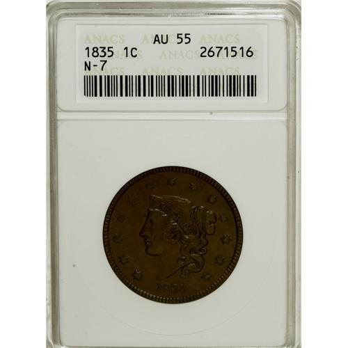 <B>1835 1C Head of 1836 AU55 ANACS.</B></I> N-7. NGC Census: (32/200). PCGS Population (7/34). Mintage: 3,878,400. Numismedia Wsl. Price for NGC/PCGS coin in AU55: $167. (#1714)<BR><BR><b>Shipping:</b> Coins & Currency (<a target="_blank" href="http://www.heritageauctions.com/common/shipping.php">view shipping information</a>)