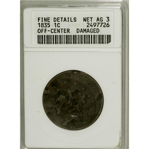 <B>1835 1C Head of 1836--Off-Center, Damaged--ANACS. Fine Details, Net AG3.</B></I> NGC Census: (0/184). PCGS Population (0/60). Mintage: 3,878,400. (#1714)<BR><BR><b>Shipping:</b> Coins & Currency (<a target="_blank" href="http://www.heritageauctions.com/common/shipping.php">view shipping information</a>)
