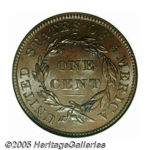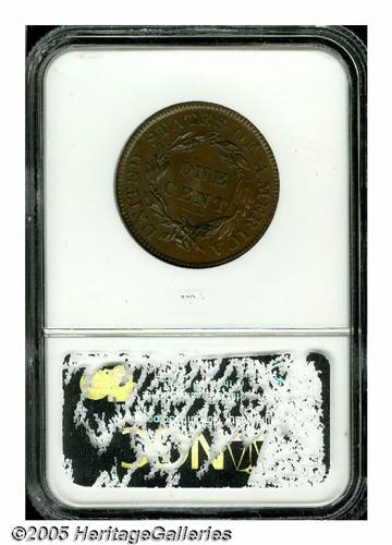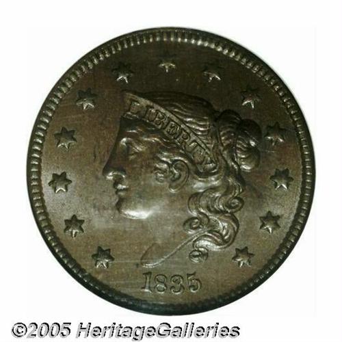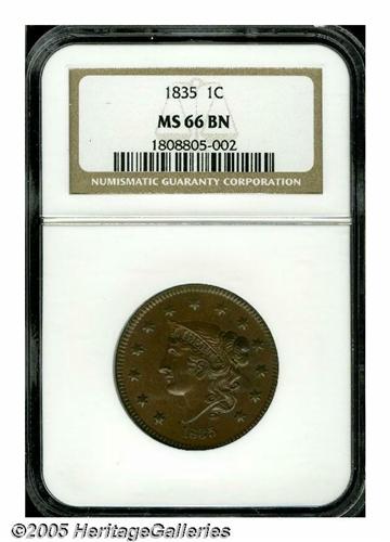 <B>1835<1C> Head of 1836 MS66 Brown NGC.</B></I> N-14, R.2. A lovely, high grade, and very impressive example of this important large cent type. The surfaces are glossy with mellowed, even, reddish-brown surfaces. Fully struck in the centers with the usual softness on the peripheral stars. Tied for finest certified with two other pieces at NGC (3/05).