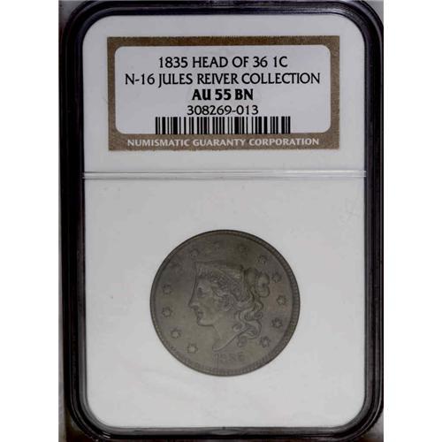 1835 1C Head of 1836. N-16, R.2. AU55 NGC. VF35 EAC. D 1835[1C] Head of 1836. N-16, R.2. AU55 NGC. V