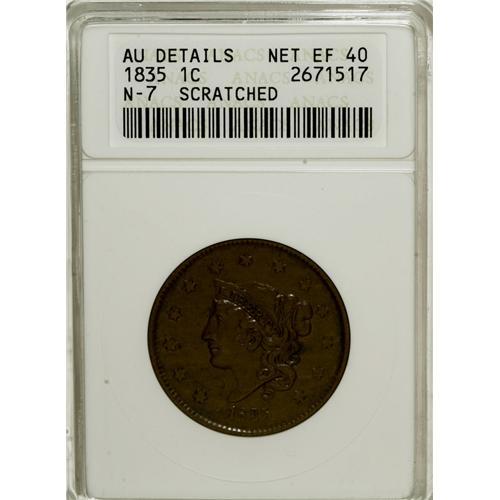 <B>1835 1C Head of 1836--Scratched--ANACS. AU Details Net XF40.</B></I> N-7. NGC Census: (20/268). PCGS Population (1/51). Mintage: 3,878,400. Numismedia Wsl. Price for NGC/PCGS coin in XF40: $120. (#1714)<BR><BR><b>Shipping:</b> Coins & Currency (<a target="_blank" href="http://www.heritageauctions.com/common/shipping.php">view shipping information</a>)