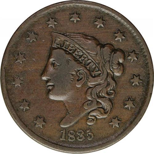 <B>1835<1C> Head of 1836. N-15, R.2. XF40 NGC. VF20 EAC.</B></I> Front line of coronet curved. Small die defect below the space between 35. Liberty's profile is doubled, as are IBERTY and stars 7 through 9. The obverse and reverse rims are irregularly made. Deep reddish-brown coloration over each side.<BR><I>Ex: George Ramont (10/23/1969).</B></I> Envelope Included.