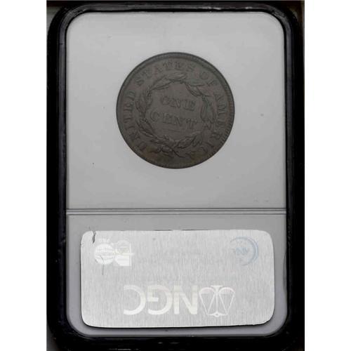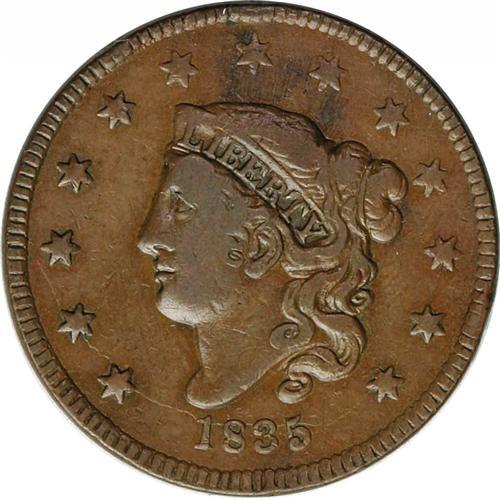 <B>1835<1C> Small 8 and Stars. N-4, High R.4. VF25 NGC. Fine 15 EAC.</B></I> An early die state with only fine die cracks. A pleasing example with light golden-olive surfaces and only the slightest abrasions. Only about 80 to 100 examples of this variety are known, with different die states represented. This is certainly a small population for the number of collectors pursuing the series.<BR><I>Ex: Darwin B. Palmer, Jr. (4/4/1973).</B></I>