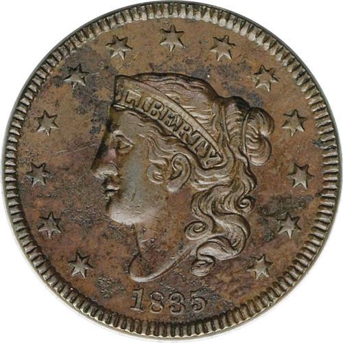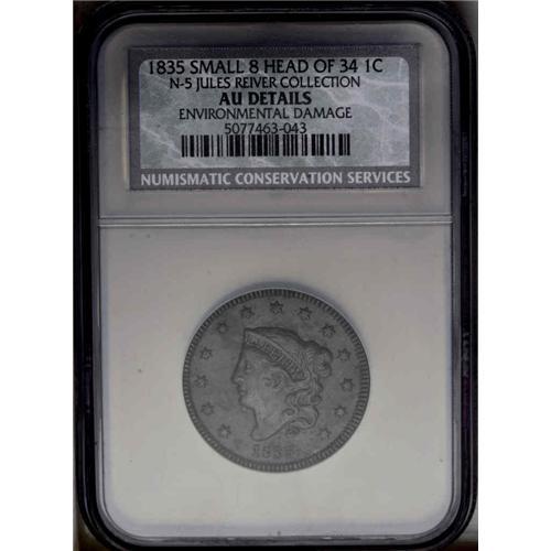 <B>1835<1C> Small 8 and Stars. N-5, R.2--Environmental Damage--NCS. AU Details. VF30 EAC.</B></I> An early die state. Deep steel, olive, and maroon patina with considerable light corrosion on each side, but mostly on the obverse.<BR><I>Ex: Raymond Gallo (2/26/1969).</B></I>