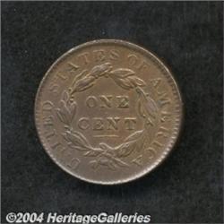 <table><tr><td><table><tr><td>1835 1C Small 8 and Stars AU58 Uncertified. N-5, R.2. A tan-brown Cent with unmarked fields and a couple of trivial abrasions on the portrait. The stars are typically struck, but the legends and devices are otherwise sharp. Traces of aqua verdigris are noted near 3 o'clock on the reverse. <BR><BR><B>Important notice:</B> Heritage usually auctions material at the rate of 200-250 lots per hour. On some occasions eBay Live bid software or the Internet may not be able to keep up with the pace of the auction. We recommend placing a realistic absentee bid now as insurance to avoid disappointment. Occasionally the auctioneer may eliminate or reject an eBay Live bid, and the auctioneer may also reopen a lot after the close of the eBay live bidding (usually because we missed an audience bid), and may reject your bid even if it shows you as the winning bidder. By bidding via eBay Live, you agree that Heritage may award the lot to another bidder at its sole discretion under the circumstances described above or any other reasonable circumstances. Since eBay bids are not shown to us until we open the lot on the floor, we treat those bids just like floor bids. In most cases the floor responds before the eBay bid is presented to us, due to Internet lag time, so for consistency we have made it a policy that floor bids are always considered first over tie eBay live bids. Also please note that all Heritage lots purchased through eBay Live carry a 20% Buyer's Premium. Please make sure you read the Terms and Conditions before you bid. <BR><BR><B>IMPORTANT ANNOUNCEMENT ABOUT RESERVES:</B> Heritage now divulges all reserves on its web site 7 days before every auction. If you want to know whether the reserve on this lot has been met, and if not, what the reserve amount is, please visit this lot page on the HeritageCoin.com web site, or email: bid@HeritageGalleries.com </span></font></td></tr></table></td></tr></table>