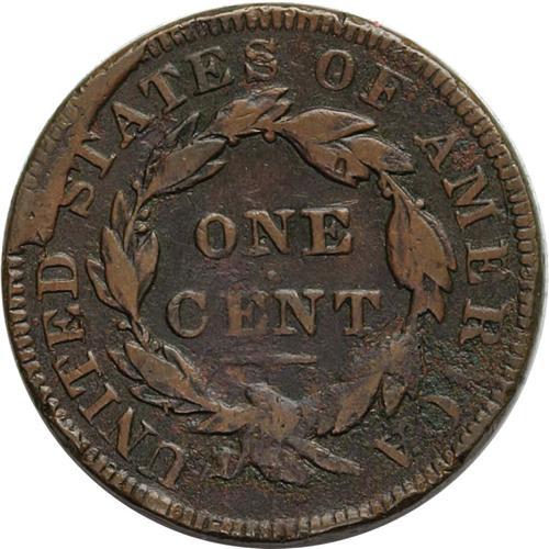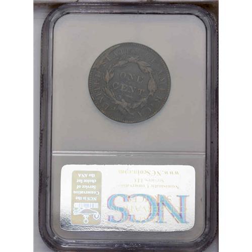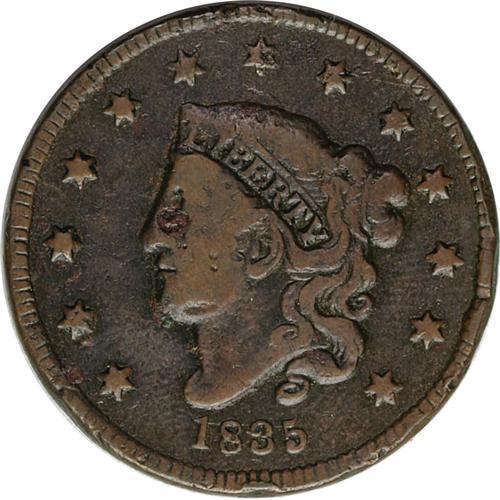 <B>1835<1C> Small 8 and Stars. N-10, R.4--Corroded--NCS. VF Details. Good 4 EAC.</B></I> The variety is confirmed by an obverse die crack through stars 10 to 13, the date, and ending at the rim adjacent to star 3. The later die state is verified by a broad retained cud over ST, on the reverse. A die crack exits the top of E in AMERICA, and gives this letter the appearance of a doubled serif. This example has dark charcoal-brown fields and tan devices, with moderate corrosion on both sides.<BR><I>Ex: Darwin B. Palmer, Jr. (4/6/1973).</B></I> Envelope Included.