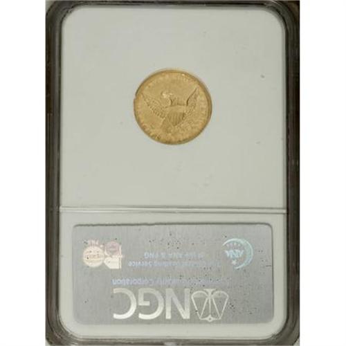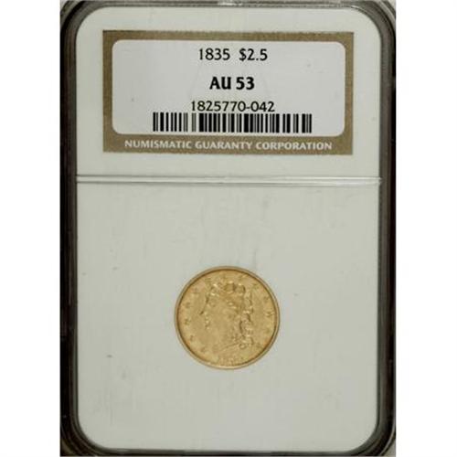 <B>1835 $2 1/2 AU53 NGC.</B></I> McCloskey-1, R.2. Luster is ample for the grade. The minutely granular fields are intermittently abraded, with a mark noted above the right (facing) wingtip.<BR><BR><B>Coin Engraver:</B> William Kneass<BR><BR><b>Shipping:</b> Coins & Currency (<a target="_blank" href="http://www.heritageauctions.com/common/shipping.php">view shipping information</a>)