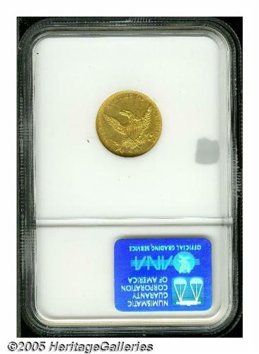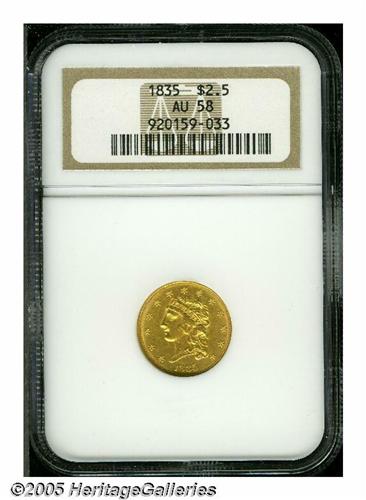 <B>1835<$2 1/2> AU58 NGC.</B></I> McCloskey-1, R.2. Wide AM in AMERICA. The stars are needle-sharp on this partly lustrous canary-gold Borderline Uncirculated example. The centers exhibit softness characteristic of the type. Clean for the grade aside from a wispy vertical pinscratch in the upper left obverse field.<BR><I>From The Stig Ericsson Collection.</B></I>