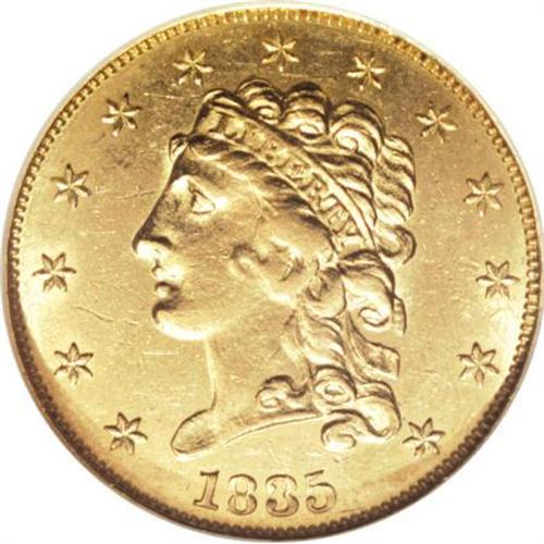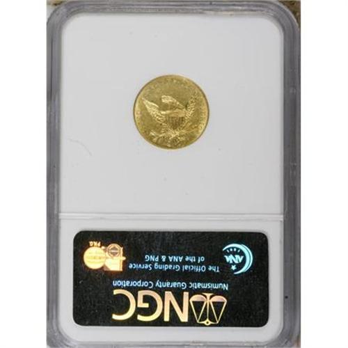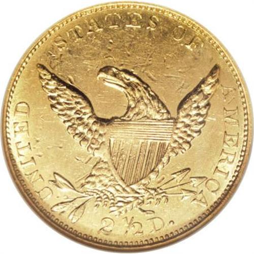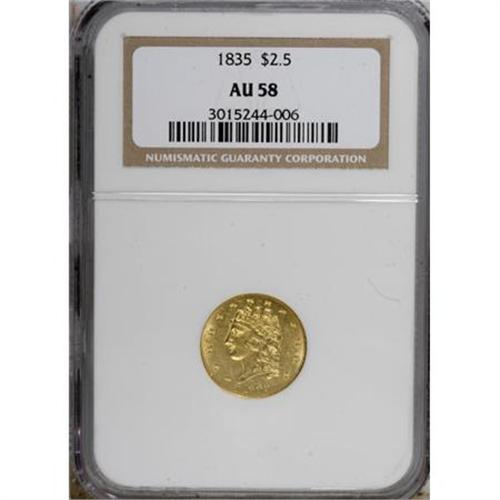 <B>1835 $2 1/2 AU58 NGC.</B></I> McCloskey-1, R.2. Wide AM in AMERICA, confirming the variety. Canary gold surfaces on this high-end AU specimen retain considerable luster, and exhibit sharply struck design elements, except for weakness in the centers. A few moderate marks are scattered about both sides.<BR><BR><B>Coin Engraver:</B> William Kneass<BR><BR><b>Shipping:</b> Coins & Currency (<a target="_blank" href="http://www.heritageauctions.com/common/shipping.php">view shipping information</a>\)