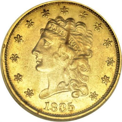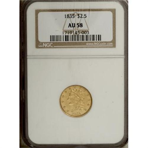 <B>1835 $2 1/2 AU58 NGC.</B></I> McCloskey-1, R.2. An unblemished Borderline Uncirculated piece that has a good strike despite the characteristic blending of detail at the centers. The stars, dentils, and plumage are intricate. A pair of tiny obverse rim defects near 9 o'clock appear to be of mint origin.<BR><BR><B>Coin Engraver:</B> William Kneass<BR><BR><b>Shipping:</b> Coins & Currency (<a target="_blank" href="http://www.heritageauctions.com/common/shipping.php">view shipping information</a>)