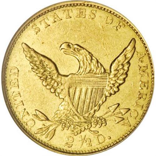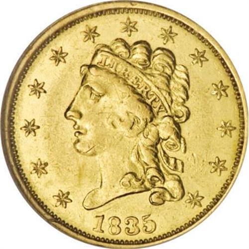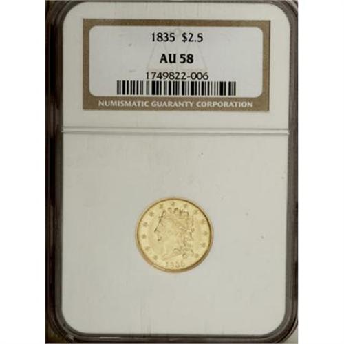 <B>1835 $2 1/2 AU58 NGC.</B></I> McCloskey-1, R.2. A band of bright luster dominates the peripheries. The eagle and Liberty's hair are also lustrous. The hair near the ear and the eagle's shield are inexactly defined, but the remainder of the designs are bold. Brief marks on the chin and above the 1 in the date are worth only passing mention.<BR><BR><B>Coin Engraver:</B> William Kneass<BR><BR><b>Shipping:</b> Coins & Currency (<a target="_blank" href="http://www.heritageauctions.com/common/shipping.php">view shipping information</a>)
