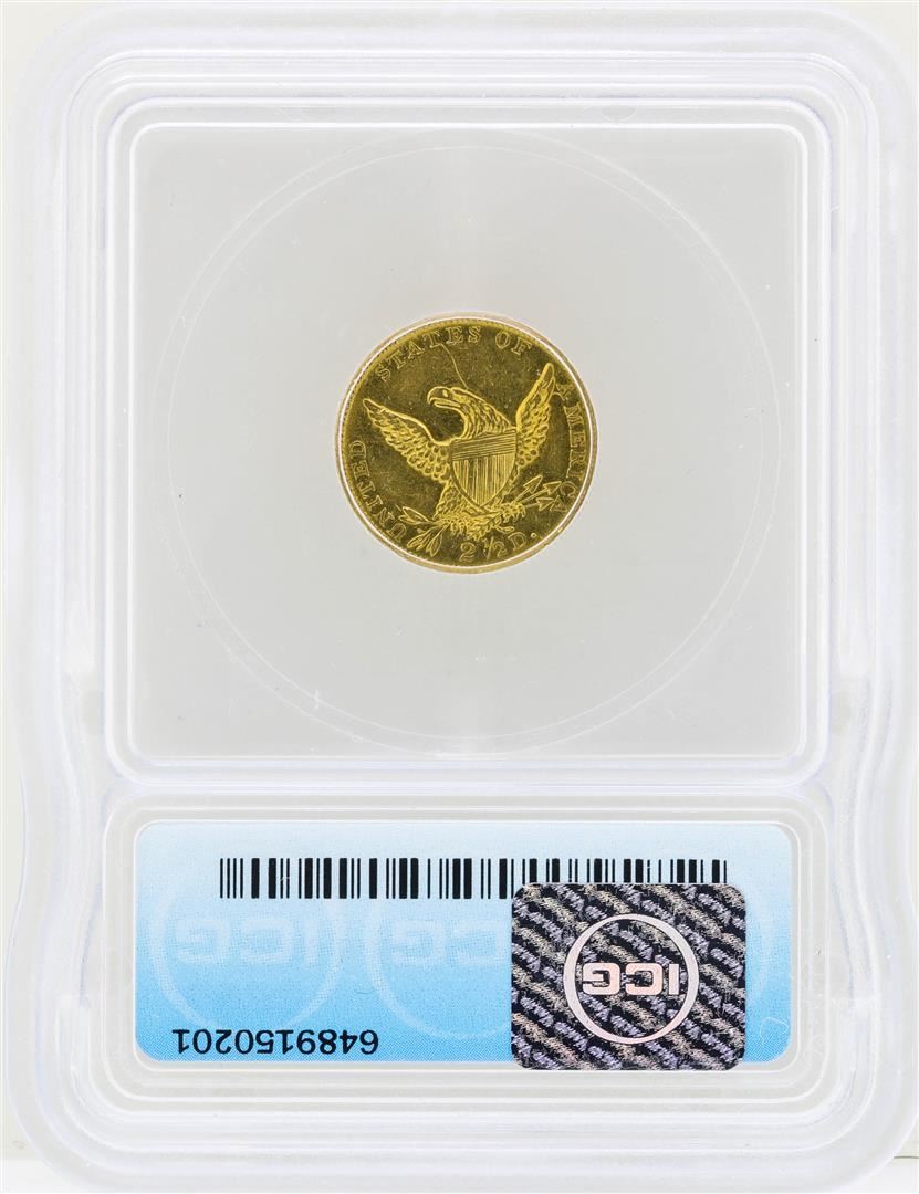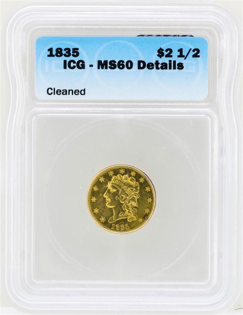 One 1835 $2 1/2 Classic Head Quarter Eagle Gold Coin ICG MS60 Details. ICG Certified.