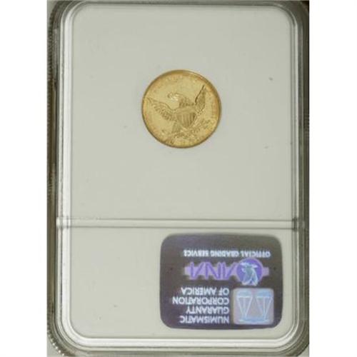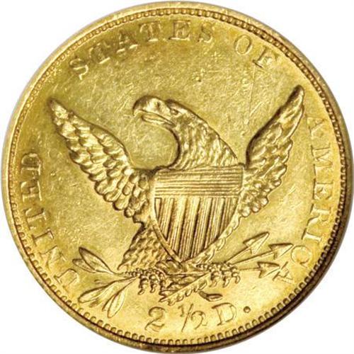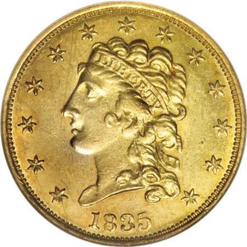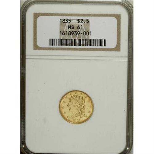 <B>1835 $2 1/2 MS61 NGC.</B></I> McCloskey-1, R.2. A lightly abraded piece with only a single reportable abrasion, a hair-thin mark beneath the F in OF. The strike is above average, since the vertical shield lines have only a hint of incomplete detail. Luster dominates the legends and devices. Census: 25 in 61, 51 finer (10/07).<BR><BR><B>Coin Engraver:</B> William Kneass<BR><BR><b>Shipping:</b> Coins & Currency (<a target="_blank" href="http://www.heritageauctions.com/common/shipping.php">view shipping information</a>)