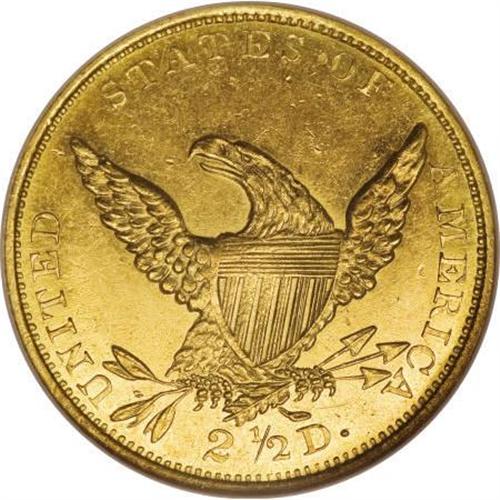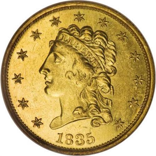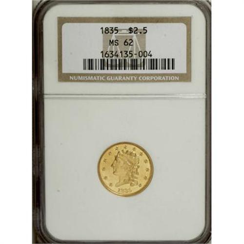<B>1835 $2 1/2 MS62 NGC.</B></I> McCloskey-1, R.2. The usual die variety for the date, with a widely spaced AM in AMERICA. A faint die crack passes through star 6. The A in STATES is high. A prooflike example, although not certified as such since the NGC holder generation precedes the designation for gold coins. The centers are slightly soft, and the fields are only lightly abraded. Certain to be of interest to the specialist.<BR><BR><B>Coin Engraver:</B> William Kneass<BR><BR><b>Shipping:</b> Coins & Currency (<a target="_blank" href="http://www.heritageauctions.com/common/shipping.php">view shipping information</a>\)