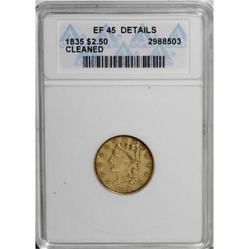 <B>1835 $2 1/2 --Cleaned--ANACS. XF45 Details.</B></I> NGC Census: (20/207). PCGS Population (20/106). Mintage: 131,402. Numismedia Wsl. Price for NGC/PCGS coin in XF45: $814. (#7693)<BR><BR><B>Coin Engraver:</B> William Kneass<BR><BR><b>Shipping:</b> Coins & Currency (<a target="_blank" href="http://www.heritageauctions.com/common/shipping.php">view shipping information</a>\)