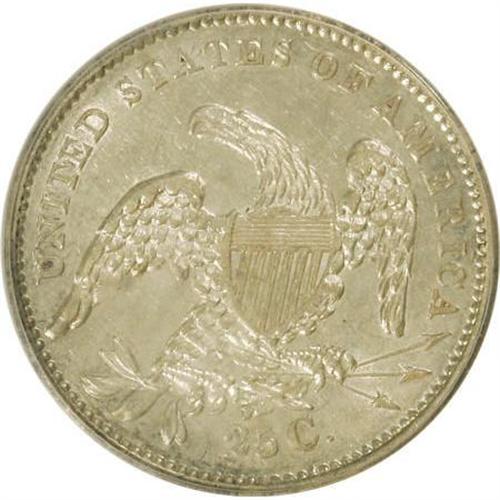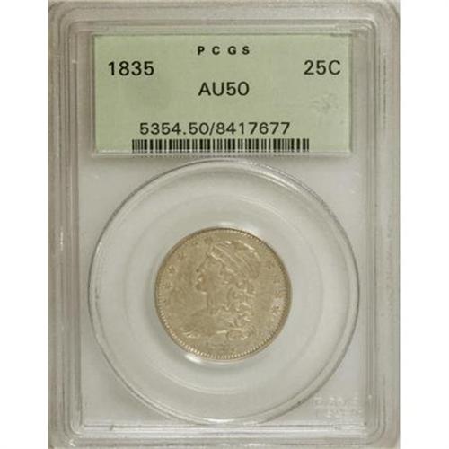 <B>1835 25C AU50 PCGS.</B></I> PCGS Population (31/122). NGC Census: (22/180). Mintage: 1,952,000. Numismedia Wsl. Price for NGC/PCGS coin in AU50: $555. (#5354)<BR><BR><B>Coin Engraver:</B> William Kneass<BR><BR><b>Shipping:</b> Coins & Currency (<a target="_blank" href="http://www.heritageauctions.com/common/shipping.php">view shipping information</a>)