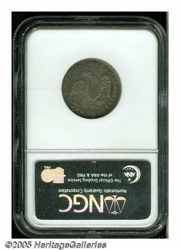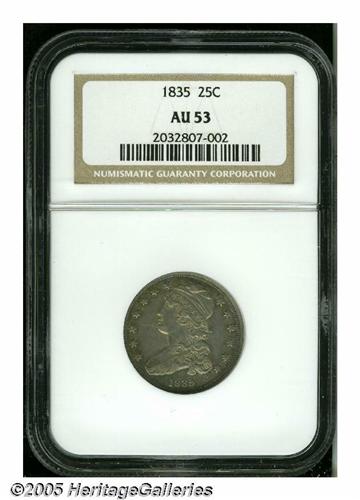 <B>1835<25C> AU53 NGC.</B></I> B-4, R.3. A semi-circle die crack across the portrait aids attribution of the variety. Luster glimmers on the eagle's plumage and throughout the legends. A problem-free steel-gray piece that reveals peripheral sky-blue, plum, and olive hues when rotated beneath a light.<BR><I>From the Dr. Kurt Peters Collection.</B></I> From the Dr. Kurt Peters Collection.
