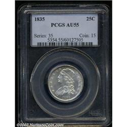 <TABLE cellSpacing=0 cellPadding=0 width="100%" bgColor=#000000 border=0><TBODY><TR><TD width="100%"><TABLE cellSpacing=1 cellPadding=3 width="100%" border=0><TBODY><TR><TD width="100%" bgColor=#79735c><FONT face=arial color=#ffffff size=3><B>Description</B> </FONT></TD></TR><TR><TD width="100%" bgColor=#ffffff><FONT face=arial size=2><B>1835 25C AU55 PCGS.</B></I> B-1, R.1. A lengthy mint-made die crack wanders across much of the upper reverse and provides ready attribution. Impressive luster brightens the margins and devices. The sharply struck and untoned surfaces offer only relatively minor handling marks. </FONT></TD></TR></TBODY></TABLE></TD></TR></TBODY></TABLE><BR><A name=PricesRealized></A><TABLE cellSpacing=0 cellPadding=0 width="100%" bgColor=#000000 border=0><TBODY><TR><TD width="100%"><TABLE cellSpacing=1 cellPadding=3 width="100%" border=0><TBODY><TR><TD width="100%" bgColor=#79735c><A name=PR><FONT face=arial color=#ffffff size=3><B>Previous Prices from Heritage Auctions</B> </FONT></A></TD></TR><TR><TD bgColor=#f6f6ed><TABLE cellSpacing=0 cellPadding=0 width="100%" border=1><TBODY><TR><TD align=middle width="33%"><B>Date</B></TD><TD align=middle width="33%"><B>Service</B></TD><TD align=middle width="33%"><B>Price</B></TD></TR><TR bgColor=whitesmoke><TD width="33%"><B>02/13/2001</B></TD><TD width="33%">NGC</TD><TD width="33%">$430.00</TD></TR></TBODY></TABLE></TD></TR><TR><TD bgColor=#ffffff><FONT face=arial size=1 ?>PLEASE NOTE: All prices realized reflect the final hammer price PLUS the buyer's premium in auctions that charge a buyer's premium. Each item has a notation at the top of the listing indicating whether that lot included a buyer's premium. Example: A item that sells with a final hammer price of $100 and a 20% buyer's premium will display with a price realized of $120. All information listed is intended to be as accurate as possible, but errors are possible. Please use this guide carefully and inform us of any inaccuracies. </FONT></TD></TR></TBODY></TABLE></TD></TR></TBODY></TABLE><BR><TABLE cellSpacing=0 cellPadding=0 width="100%" bgColor=#000000 border=0><TBODY><TR><TD width="100%"><TABLE cellSpacing=1 cellPadding=3 width="100%" border=0><TBODY><TR><TD width="100%" bgColor=#79735c colSpan=6><FONT face=arial color=#ffffff size=3><B>Price Guide*</B> </FONT></TD></TR><TR bgColor=#f6f6ed><TD align=middle><B>Grade</B> </TD><TD align=middle><B>Coin World<BR>(Trends)</B> </TD><TD align=middle><B>Numismedia<BR>Retail</B> </TD><TD align=middle><B>Numismedia<BR>Wholesale</B> </TD><TD align=middle><B>Coin<BR>Universe</B> </TD><TD align=middle><B>Heritage<BR>Value Index</B> </TD></TR><TR bgColor=#ffffff><TD align=middle>53</TD><TD align=right>---</TD><TD align=right>$565.00</TD><TD align=right>$471.00</TD><TD align=right>---</TD><TD align=right>$446.33</TD></TR><TR style="FONT-WEIGHT: bold" bgColor=#cccfdd><TD align=middle>55</TD><TD align=right>$625.00</TD><TD align=right>$600.00</TD><TD align=right>$500.00</TD><TD align=right>$680.00</TD><TD align=right>$460.19</TD></TR><TR bgColor=#ffffff><TD align=middle>58</TD><TD align=right>---</TD><TD align=right>$660.00</TD><TD align=right>$550.00</TD><TD align=right>---</TD><TD align=right>$516.40</TD></TR><TR bgColor=#ffffff><TD colSpan=6><FONT size=1>*All information listed is intended to be as accurate as possible, but errors are possible. No item may be returned or refused based on this information which is provided as a service to our customers. You should contact each pricing source directly to determine the accuracy of this information. </FONT></TD></TR></TBODY></TABLE></TD></TR></TBODY></TABLE><BR><TABLE cellSpacing=0 cellPadding=0 width="100%" bgColor=#000000 border=0><TBODY><TR><TD width="100%"><TABLE cellSpacing=1 cellPadding=3 width="100%" border=0><TBODY><TR><TD width="100%" bgColor=#79735c><FONT face=arial color=#ffffff size=3><B>Population Guide</B> </FONT></TD></TR><TR bgColor=#ffffff><TD align=middle><!-- Begin Output of Population Grid--><TABLE cellSpacing=0 cellPadding=0 width="100%" border=0><TBODY><TR><TD vAlign=center><TABLE cellSpacing=0 width="100%" border=1 cellsadding="3"><TBODY><TR><TD vAlign=center><TABLE cellSpacing=0 cellPadding=3 width="100%" border=1><TBODY><TR><TD vAlign=center align=middle bgColor=#f0f1e8 colSpan=2 <CENTER><FONT face=Arial size=2><B>PCGS Pop </B></FONT><CENTER></CENTER></TD><TD vAlign=center align=middle bgColor=#f0f1e8 colSpan=2><CENTER><FONT face=Arial size=2><B>NGC Pop</B></CENTER></FONT></TD></TR><TR><TD vAlign=center><FONT face=Arial size=2>(55)</FONT> </TD><TD vAlign=center align=right><FONT face=Arial size=2>21</FONT> </TD><TD vAlign=center><FONT face=Arial size=2>(55)</FONT> </TD><TD vAlign=center align=right><FONT face=Arial size=2>15</FONT> </TD></TR><TR><TD vAlign=center><FONT face=Arial size=2>(>55)</FONT> </TD><TD vAlign=center align=right><FONT face=Arial size=2>73</FONT> </TD><TD vAlign=center><FONT face=Arial size=2>(>55)</FONT> </TD><TD vAlign=center align=right><FONT face=Arial size=2>117</FONT> </TD></TR></TBODY></TABLE></TD></TR></TBODY></TABLE></TD></TR></TBODY></TABLE><!-- End Output of Population Grid--> Important notice: Heritage usually auctions material at the rate of 200-250 lots per hour. On some occasions eBay Live bid software or the Internet may not be able to keep up with the pace of the auction. We recommend placing a realistic absentee bid now as insurance to avoid disappointment. Occasionally the auctioneer may eliminate or reject an eBay Live bid, and the auctioneer may also reopen a lot after the close of the eBay live bidding (usually because we missed an audience bid), and may reject your bid even if it shows you as the winning bidder. By bidding via eBay Live, you agree that Heritage may award the lot to another bidder at its sole discretion under the circumstances described above or any other reasonable circumstances. Also please note that all Heritage lots purchased through eBay Live carry a 20% Buyer's Premium. Please make sure you rea