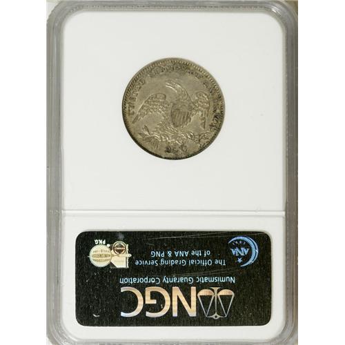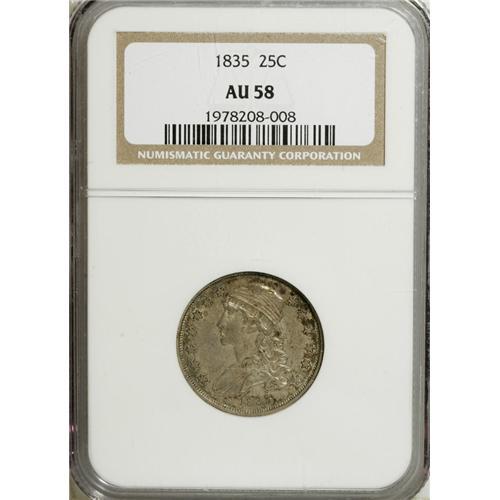 <B>1835 25C AU58 NGC.</B></I> B-7, R.2. There is no period after 25 C, diagnostic for B-7 and a minor mint blunder. This dove-gray Capped Bust quarter offers peripheral russet-brown toning, and luster glows from the borders and devices. Faint marks are noted above the date and near the eagle's neck.<BR><BR><b>Shipping:</b> Coins & Currency (<a target="_blank" href="http://www.heritageauctions.com/common/shipping.php">view shipping information</a>)