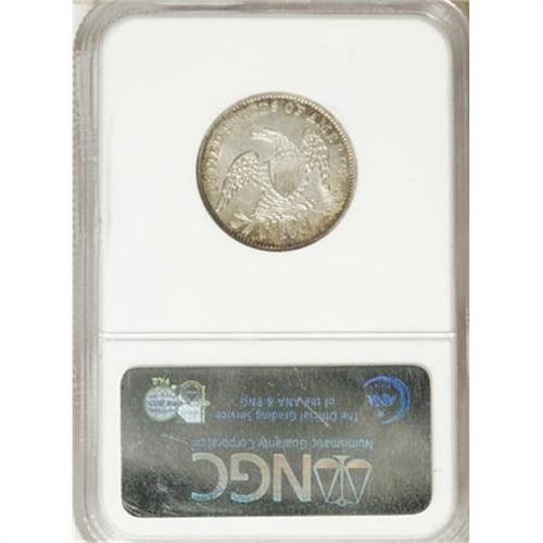 <B>1835 25C AU58 NGC.</B></I> B-2, R.2. Lovely golden-brown and cobalt-blue patina adorns the peripheries, while the centers are silver-gray. A sharply impressed coin that shows a slightly later die state, with clashed dies and a die crack through the 5 in the date, extending nearly to star 13. Attractive surfaces which show the expected tiny lines and nicks from brief circulation, but no major problems or distractions. <BR><BR><B>Coin Engraver:</B> William Kneass<BR><BR><b>Shipping:</b> Coins & Currency (<a target="_blank" href="http://www.heritageauctions.com/common/shipping.php">view shipping information</a>)