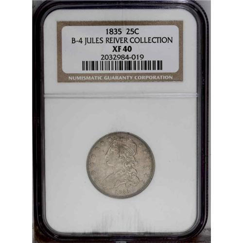 <B>1835<25C> B-4, R.4. XF40 NGC. Die State III.</B></I> Curl wholly over 5; No tongue, 25 C low. Light silver gray and pleasing for the grade, with even toning and a decent strike for this middle die state. Fairly scarce as a variety as the obverse die really broke apart as more were coined.<BR><I>Ex: Bergen Sale (10/1979), lot 89.</B></I> Envelope Included.