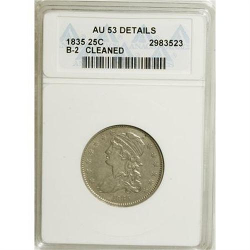 <B>1835 25C --Cleaned--ANACS. AU53 Details.</B></I> B-2. NGC Census: (14/166). PCGS Population (13/109). Mintage: 1,952,000. Numismedia Wsl. Price for NGC/PCGS coin in AU53: $565. (#5354)<BR><BR><b>Shipping:</b> Coins & Currency (<a target="_blank" href="http://www.heritageauctions.com/common/shipping.php">view shipping information</a>)