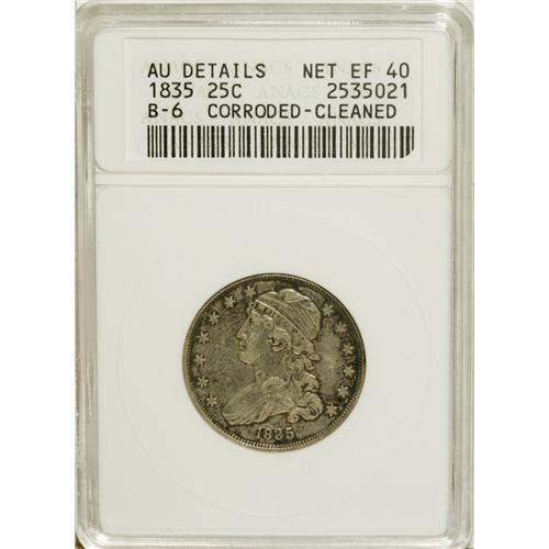 <B>1835 25C --Cleaned, Corroded--ANACS. AU Details Net XF40.</B></I> B-6. NGC Census: (52/496). PCGS Population (29/180). Mintage: 1,952,000. Numismedia Wsl. Price for NGC/PCGS coin in XF40: $267. (#5354)<BR><BR><b>Shipping:</b> Coins & Currency (<a target="_blank" href="http://www.heritageauctions.com/common/shipping.php">view shipping information</a>)
