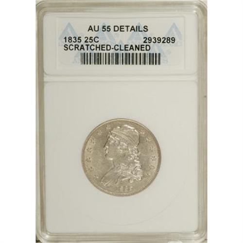 <B>1835 25C --Cleaned, Scratched--ANACS. AU55 Details.</B></I> NGC Census: (41/125). PCGS Population (24/85). Mintage: 1,952,000. Numismedia Wsl. Price for NGC/PCGS coin in AU55: $580. (#5354)<BR><BR><b>Shipping:</b> Coins & Currency (<a target="_blank" href="http://www.heritageauctions.com/common/shipping.php">view shipping information</a>)