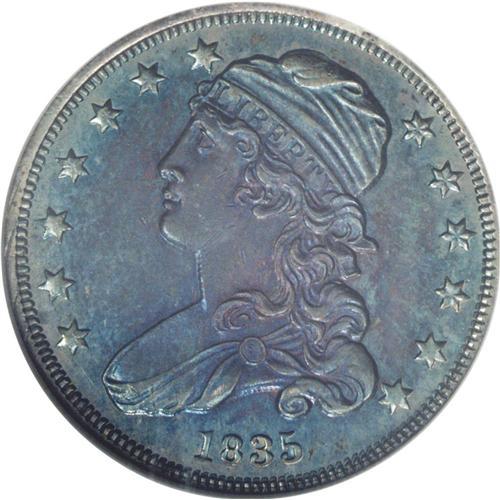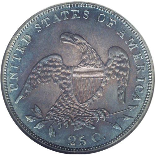 <B>1835<25C> MS64 NGC.</B></I> B-4, R.4. Die State I. Vivid ocean-blue and plum colors dominate, although a blush of peach patina graces the central reverse. Exactingly struck in the centers, with only slight softness seen on the top of the cap and the peak of the left (facing) wing. The obverse rim at 9 o'clock is uneven, and a light curved mark is noted near the cheekbone. Browning-4 is scarce in any grade, and a formidable rarity in Mint State. NGC has certified one other example as MS64, and the next highest graded is AU50 (2/06).<BR><I>From The Lake Highlands Collection.</B></I> <BR><BR><B>Importa