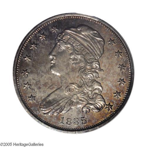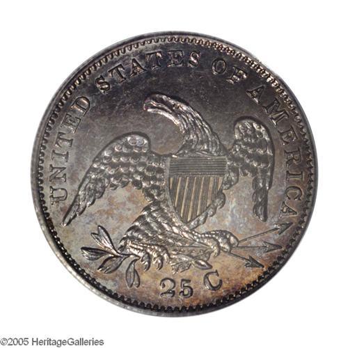<B>1835<25C> PR63 PCGS.</B></I> B-7, R.2 as a business strike, High R.7 as a proof. Dappled golden-brown and dove-gray colors endow this meticulously struck specimen. Browning-7 is readily identified as the variety without a period after the C in 25 C, and most among the handful of known proofs for the date are from this die pairing. Despite the rich toning, the fields are flashy and show no evidence of cartwheel luster. Some moderate marks are detected on the left obverse; these are by no means conspicuous because of subsequent toning. A small planchet flaw (as made) is seen beneath the first star and Liberty's neck, and serves to identify the present piece in the event of future auction appearances. Population: 1 in 63, 1 finer (10/05).