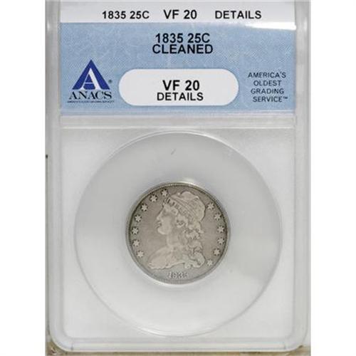 <B>1835 25C --Cleaned--ANACS. VF20 Details.</B></I> NGC Census: (5/304). PCGS Population (7/280). Mintage: 1,952,000. Numismedia Wsl. Price for NGC/PCGS coin in VF20: $104. (#5354)<BR><BR><B>Coin Engraver:</B> William Kneass<BR><BR><b>Shipping:</b> Coins & Currency (<a target="_blank" href="http://www.heritageauctions.com/common/shipping.php">view shipping information</a>)
