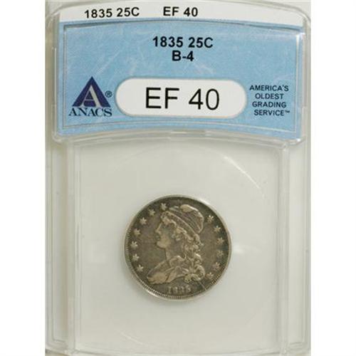 <B>1835 25C XF40 ANACS.</B></I> B-4. NGC Census: (26/249). PCGS Population (27/179). Mintage: 1,952,000. Numismedia Wsl. Price for NGC/PCGS coin in XF40: $267. (#5354)<BR><BR><b>Shipping:</b> Coins & Currency (<a target="_blank" href="http://www.heritageauctions.com/common/shipping.php">view shipping information</a>)