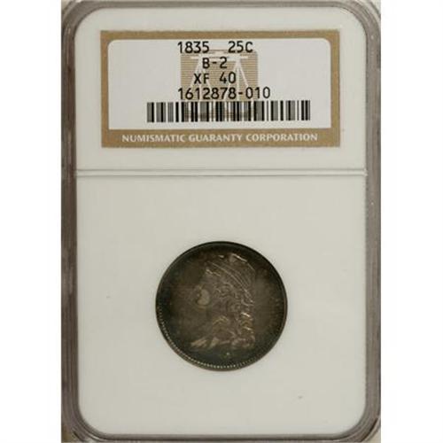 <B>1835 25C XF40 NGC.</B></I> B-2. NGC Census: (26/249). PCGS Population (32/179). Mintage: 1,952,000. Numismedia Wsl. Price for NGC/PCGS coin in XF40: $267. (#5354)<BR><BR><B>Coin Engraver:</B> William Kneass<BR><BR><b>Shipping:</b> Coins & Currency (<a target="_blank" href="http://www.heritageauctions.com/common/shipping.php">view shipping information</a>\)