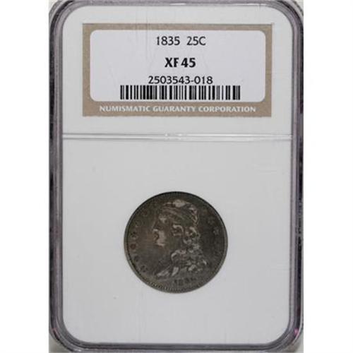 <B>1835 25C XF45 NGC</B></I>, B-2, R.2, identifiable by a leaf tip that extends past the C in the denomination, charcoal-gray on the obverse with lighter cloud-gray toning on the highpoints of that side and the reverse; and an <B>1835 25C AU55 NGC</B></I>, B-5, R.3, distinguished by recutting of OF AM on the reverse, well struck with few marks and dusky seal-gray patina with lighter color and the faintly worn highpoints.<BR><BR><B>Coin Engraver:</B> William Kneass<BR><BR><b>Shipping:</b> Coins & Currency (<a target="_blank" href="http://www.heritageauctions.com/common/shipping.php">view shipping information</a>)