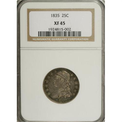 <B>1835 25C XF45 NGC.</B></I> NGC Census: (47/202). PCGS Population (26/153). Mintage: 1,952,000. Numismedia Wsl. Price for NGC/PCGS coin in XF45: $368. (#5354)<BR><BR><b>Shipping:</b> Coins & Currency (<a target="_blank" href="http://www.heritageauctions.com/common/shipping.php">view shipping information</a>)