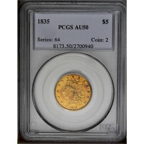 <B>1835<$5> AU50 PCGS.</B></I> First Head, Breen-6504, McCloskey 1-A, R.2. Lightly worn with deep orange surfaces accented by streaks of red. The protected areas inside the sharply struck devices harbor traces of mint luster.<BR><I>From The Carolina Gold Collection, Part Four.</B></I>