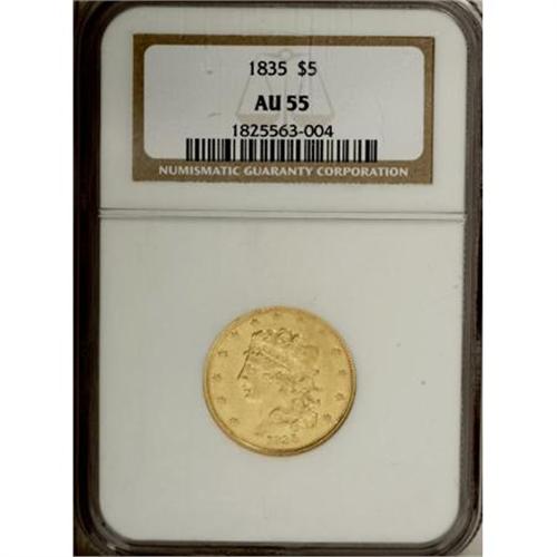 <B>1835 $5 AU55 NGC.</B></I> First Head, Breen-6504, McCloskey 1-A, R.2. The luster is thick and shimmers on this crisply struck and very attractive example. Some highpoint rub affirms the grade. Interesting shield lines, the result of a clashed die, are noted near Liberty's ear.<BR><BR><B>Coin Engraver:</B> William Kneass<BR><BR><b>Shipping:</b> Coins & Currency (<a target="_blank" href="http://www.heritageauctions.com/common/shipping.php">view shipping information</a>)