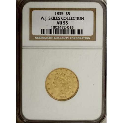<B>1835 $5 AU55 NGC.</B></I> Ex: W.J. Skiles Collection. Breen-6504, First Head, McCloskey 1-A, R.2. A sharply struck example with honey-gold coloration. There is ample luster present on both sides, with only slight wear noted on the wingtips, eyebrow, and curls. A minor mark on Liberty's chin, and another on her neck, are of little concern.<BR><BR><B>Coin Engraver:</B> William Kneass<BR><BR><b>Shipping:</b> Coins & Currency (<a target="_blank" href="http://www.heritageauctions.com/common/shipping.php">view shipping information</a>)