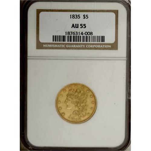 <B>1835 $5 AU55 NGC.</B></I> Breen-6504, First Head, McCloskey 1-A, R.2. A very pleasing early five with rich antique-gold surfaces and less abrasions than normally seen. A terrific, boldly-defined example for inclusion in a type set. <BR><BR><B>Coin Engraver:</B> William Kneass<BR><BR><b>Shipping:</b> Coins & Currency (<a target="_blank" href="http://www.heritageauctions.com/common/shipping.php">view shipping information</a>)