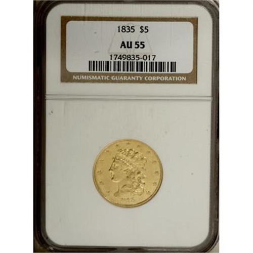 <B>1835 $5 AU55 NGC.</B></I> Second Head, McCloskey 3-D, R.3. An exciting half eagle that has retained a powerful flash and reflectivity in the fields despite some light wear. A boldly struck example that is among the most attractive Classic Head fives that this cataloguer has seen in AU condition.<BR><BR><B>Coin Engraver:</B> William Kneass<BR><BR><b>Shipping:</b> Coins & Currency (<a target="_blank" href="http://www.heritageauctions.com/common/shipping.php">view shipping information</a>)