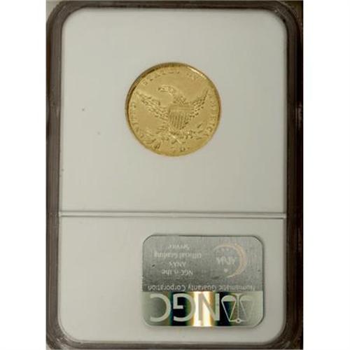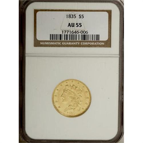 <B>1835 $5 AU55 NGC.</B></I> First Head, Breen-6504, McCloskey 1-A, R.2. Well-scattered marks are noted on both sides of this highly lustrous and flashy example as is a bold strike and even, green-gold color. One of six known die marriages for the date, 1-A is interesting for its missing arrow shafts within the eagle's claw. <BR><BR><B>Coin Engraver:</B> William Kneass<BR><BR><b>Shipping:</b> Coins & Currency (<a target="_blank" href="http://www.heritageauctions.com/common/shipping.php">view shipping information</a>)