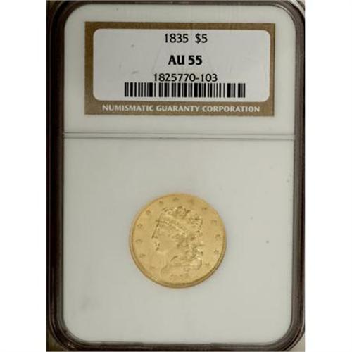 <B>1835 $5 AU55 NGC.</B></I> Second Head, Breen-6505, McCloskey 3-D, R.3. An extremely lustrous and well-struck example with wonderful, warm honey-gold color. Breen's 1988 Encyclopedia records three different portraits of 1835 half eagles, but the differences are relatively minor. It is actually easier to attribute them by the reverse dies, since the legends continued to be entered by hand on each working die until 1839.<BR><BR><B>Coin Engraver:</B> William Kneass<BR><BR><b>Shipping:</b> Coins & Currency (<a target="_blank" href="http://www.heritageauctions.com/common/shipping.php">view shipping information</a>)