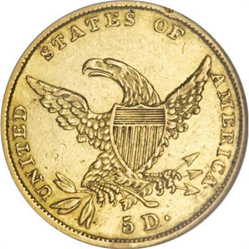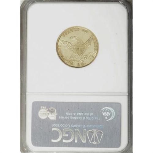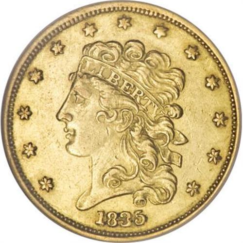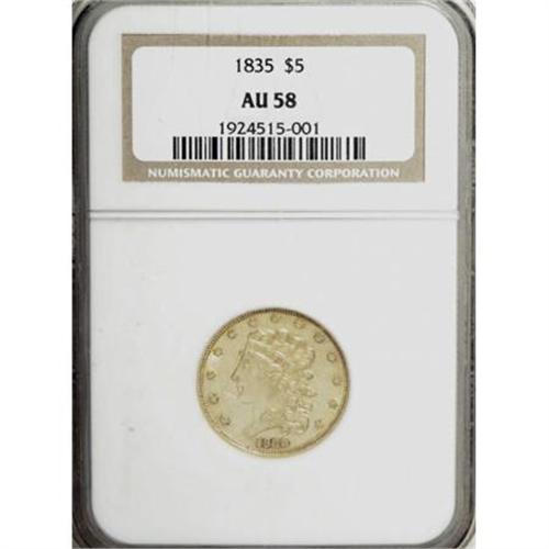 <B>1835 $5 AU58 NGC.</B></I> First Head, Breen-6504, McCloskey 1-A, R.2. Block 8 date style. The reverse has a feather ending over the left edge of the 5 in 5 D. Nearly full yellow-gold luster with lightly abraded obverse and reverse surfaces. Six different die marriages are currently known for this date.<BR><BR><B>Coin Engraver:</B> William Kneass<BR><BR><b>Shipping:</b> Coins & Currency (<a target="_blank" href="http://www.heritageauctions.com/common/shipping.php">view shipping information</a>)