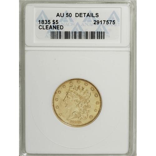 <B>1835 $5 --Cleaned--ANACS. AU50 Details.</B></I> First Head, Breen-6504, McCloskey 1-B, R.3. Bright from a relatively mild cleaning, but the strike is attentive, and ample luster graces the devices and margins.<BR><BR><b>Shipping:</b> Coins & Currency (<a target="_blank" href="http://www.heritageauctions.com/common/shipping.php">view shipping information</a>)