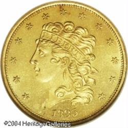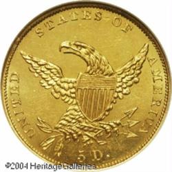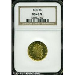 1835 $5 MS65 Prooflike NGC. Breen-6504, First Head <B>1835 $5 MS65 Prooflike NGC.</B></I> Breen-6504, First Head, McCloskey 1-B, R.3. Even though the 1835 is the third most common date in the Classic series it is, nevertheless, a very scarce item to locate in Uncirculated grades, let alone as a Gem. In fact, this is the single finest example thus far certified at NGC, either as a non-prooflike or prooflike (11/04). This is an especially attractive example that has bright yellow-golden prooflike fields and complete striking details on both sides. Lightly marked, the most obvious surface blemish is a small ink mark from the tip of Liberty's bust to the obverse rim, this only being mentioned for pedigree purposes. An important opportunity for the advanced gold specialist. <BR><BR><B>Important notice:</B> Heritage usually auctions material at the rate of 200-250 lots per hour. On some occasions eBay Live bid software or the Internet may not be able to keep up with the pace of the auction. We recommend placing a realistic absentee bid now as insurance to avoid disappointment. Occasionally the auctioneer may eliminate or reject an eBay Live bid, and the auctioneer may also reopen a lot after the close of the eBay live bidding (usually because we missed an audience bid), and may reject your bid even if it shows you as the winning bidder. By bidding via eBay Live, you agree that Heritage may award the lot to another bidder at its sole discretion under the circumstances described above or any other reasonable circumstances. Since eBay bids are not shown to us until we open the lot on the floor, we treat those bids just like floor bids. In most cases the floor responds before the eBay bid is presented to us, due to Internet lag time, so for consistency we have made it a policy that floor bids are always considered first over tie eBay live bids. Also please note that all Heritage lots purchased through eBay Live carry a 20% Buyer's Premium. Please make sure you read the Terms and Conditions before you bid. This lot is being auctioned in conjunction with a live floor auction by Heritage Galleries & Auctioneers. All final auction and invoice information will be supplied by Heritage Galleries & Auctioneers, and all other information should be considered preliminary. Lot:6632