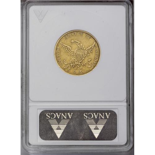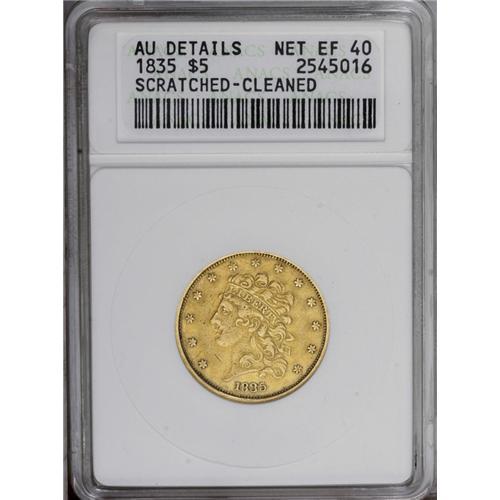 <B>1835<$5>--Scratched, Cleaned--ANACS. AU Details, Net XF40.</B></I> Breen-6504, First Head, McCloskey 1-B, R.3. Semi-bright, apricot-gold surfaces are lightly abraded, reveal some fine hairlines, and show shallow scratches on Liberty's face and in the left (facing) obverse field. The design elements are generally well defined.