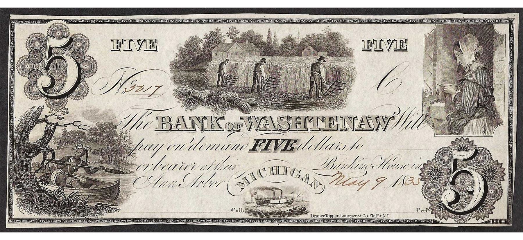 One 1835 $5 The Bank of Washtenaw Obsolete Note.