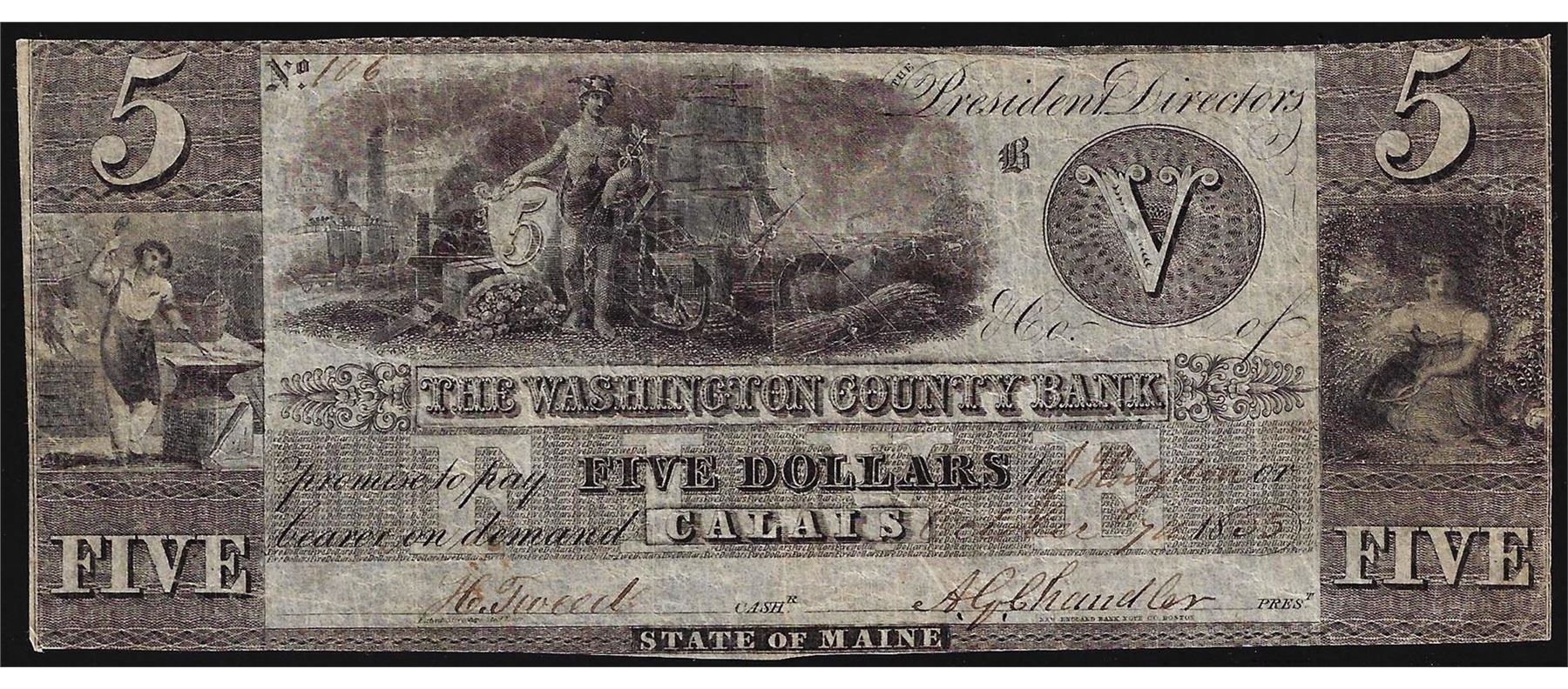 One 1835 $5 The Washington County Bank Obsolete Bank Note.