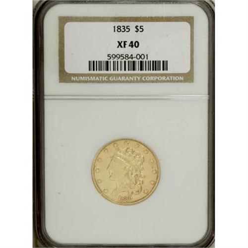 <B>1835 $5 XF40 NGC.</B></I> Second Head, Breen-6505, McCloskey 3-D, R.3. Luster emerges from Liberty's curls and the eagle's plumage and shield. A thin mark is found beneath the beak, but the subdued surfaces generally are only lightly abraded. <BR><BR><b>Shipping:</b> Coins & Currency (<a target="_blank" href="http://www.heritageauctions.com/common/shipping.php">view shipping information</a>)
